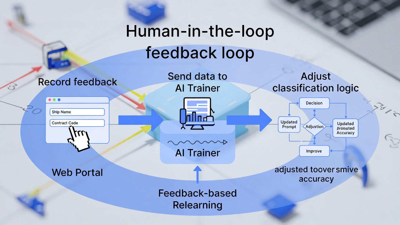 • Ghi nhận phản hồi: Khi người dùng thực hiện chỉnh sửa nhãn thủ công (ví dụ: sửa lại tên tàu hoặc mã hợp đồng) trên Web Portal, hệ thống sẽ tỉ mỉ ghi lại những hiệu chỉnh này,.